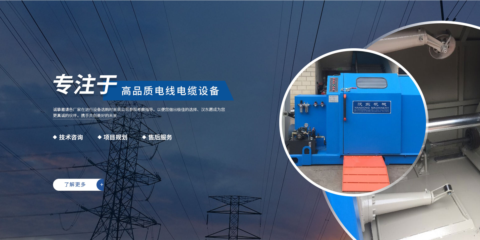 常州漢東機械始創于2006年,是集電線電纜機械設計、開發、制造、安裝、調試為一體化的高科技企業。本公司自開業以來,積極引進日本,歐美等國外電線電纜設備之先進技術,先后成功推出了達到行業先進水平的電線電纜設備,主要產品有擠出、繞包、束線、成纜等電線電纜固定設備。在提供系統設備的同時,還向客戶提供售前技術咨詢、項目規劃、以及售后服務。我公司本著“以人為本、科技先導、用戶為上”的宗旨,為客戶提供牢靠的產品與省心的服務。漢東愿成為您更真誠的伙伴,攜手共創美好的未來! 了解更多+